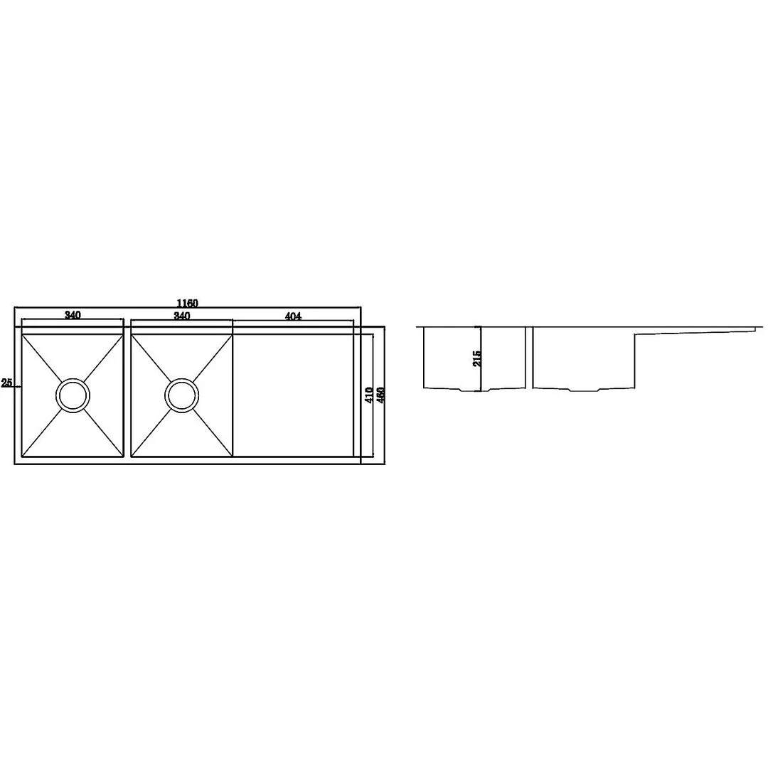 - Double sink measures 1160 x 460 x 215mm (W x L x D)