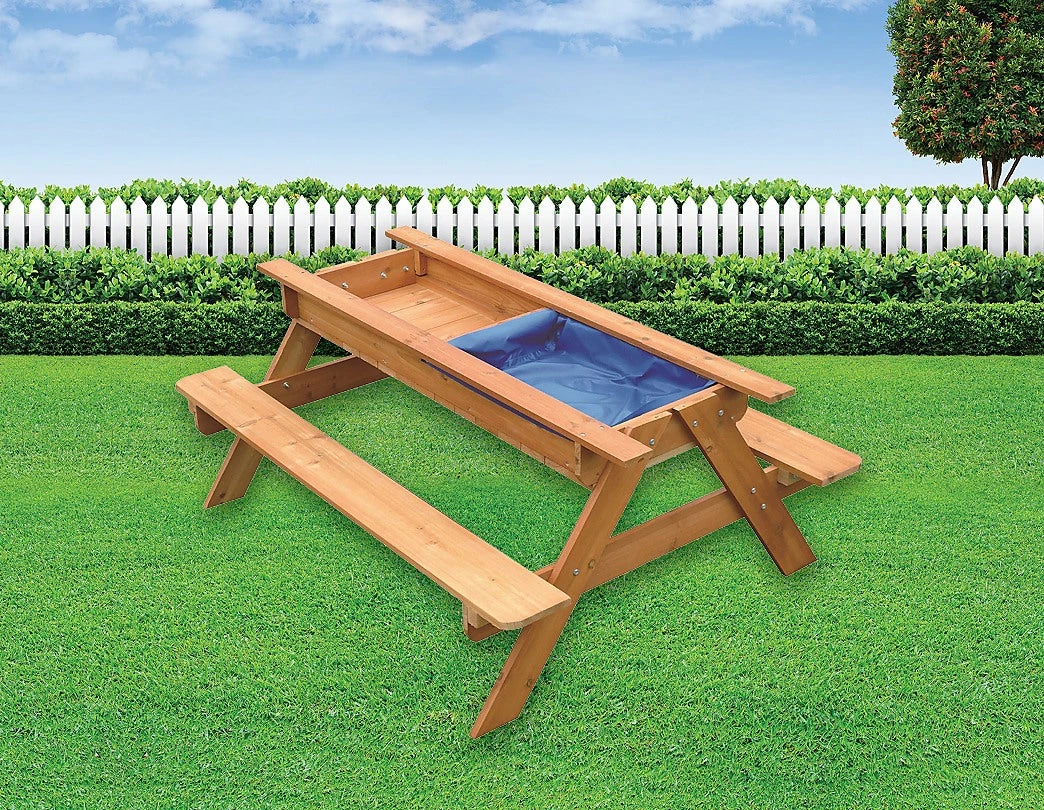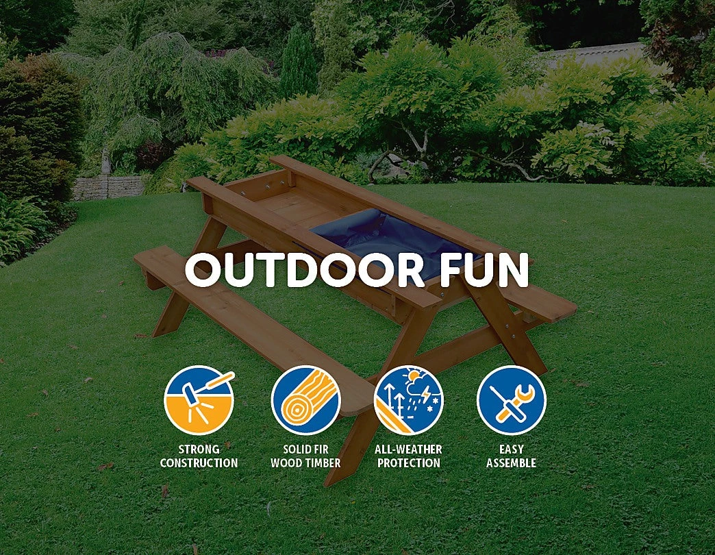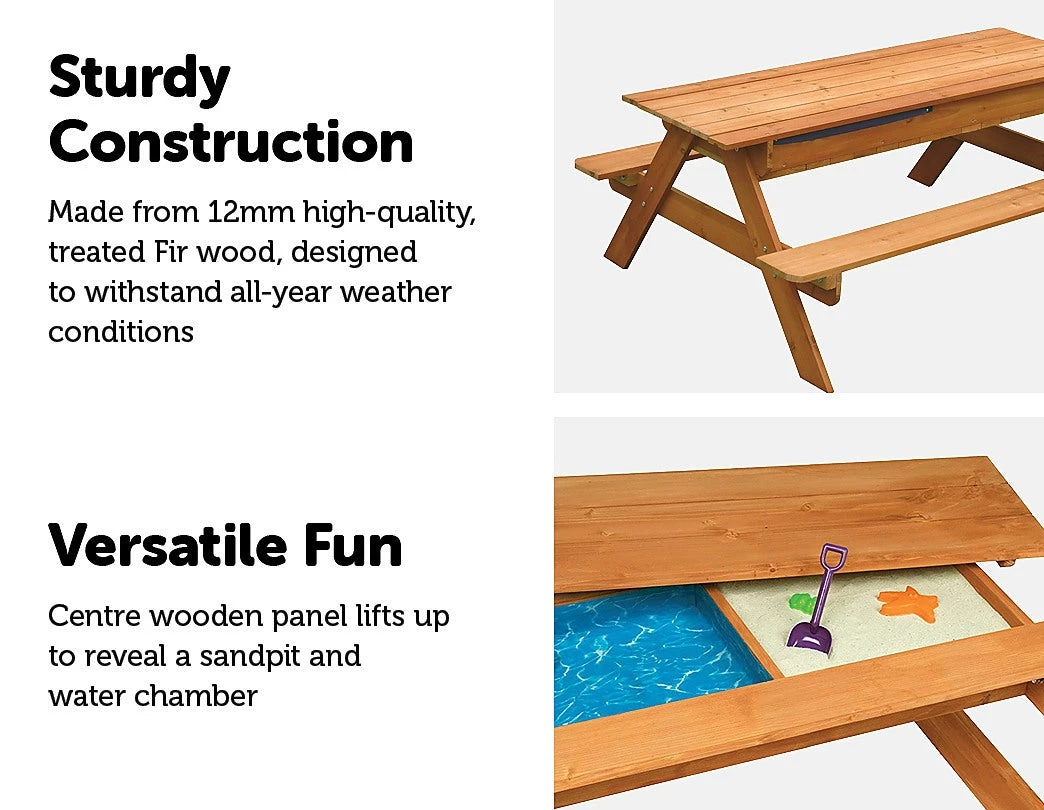 Our Sand & Water Wooden Picnic Table is ideal for doing just that. This versatile toy comes in the form of a traditional wooden picnic bench. Although it may look unassuming, the centre wooden panel lifts up to reveal a sandpit and water chamber. They can be used together or separately for hours of messy fun in the sun.