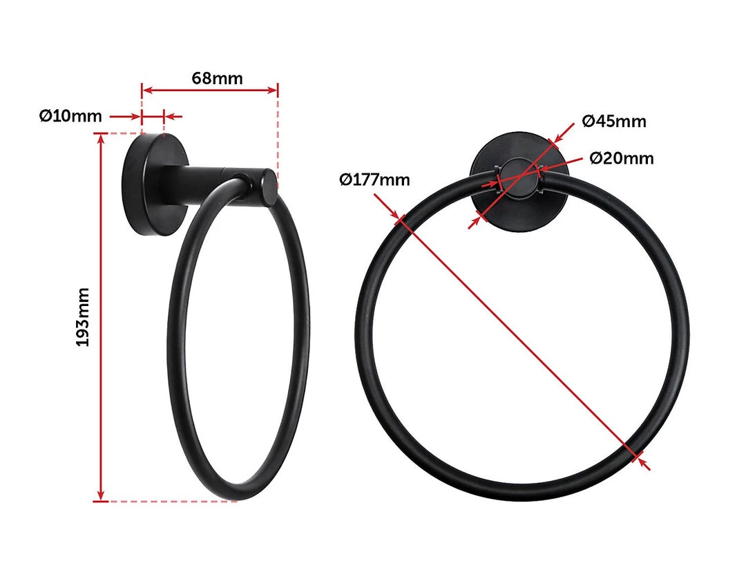 This Della Francesca Towel Ring has the dimensions of 193mm x 68mm (H x D). The overall ring diameter is 177mm total.