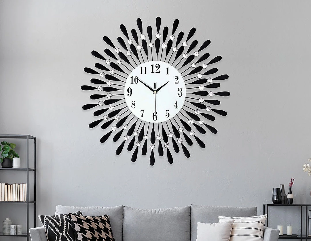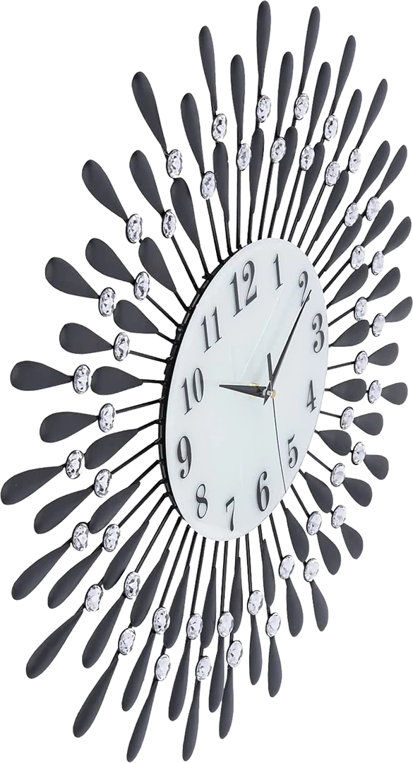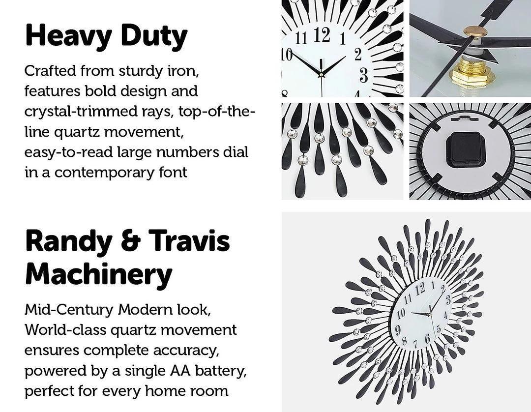 Rocking the trendy Mid-Century Modern look to perfection, this three-dimensional sunburst wall clock by Randy & Travis Machinery will become the focal point in whatever room you choose to display it. With its bold design and crystal-trimmed rays, its stunning black colour will stand out against practically any background.