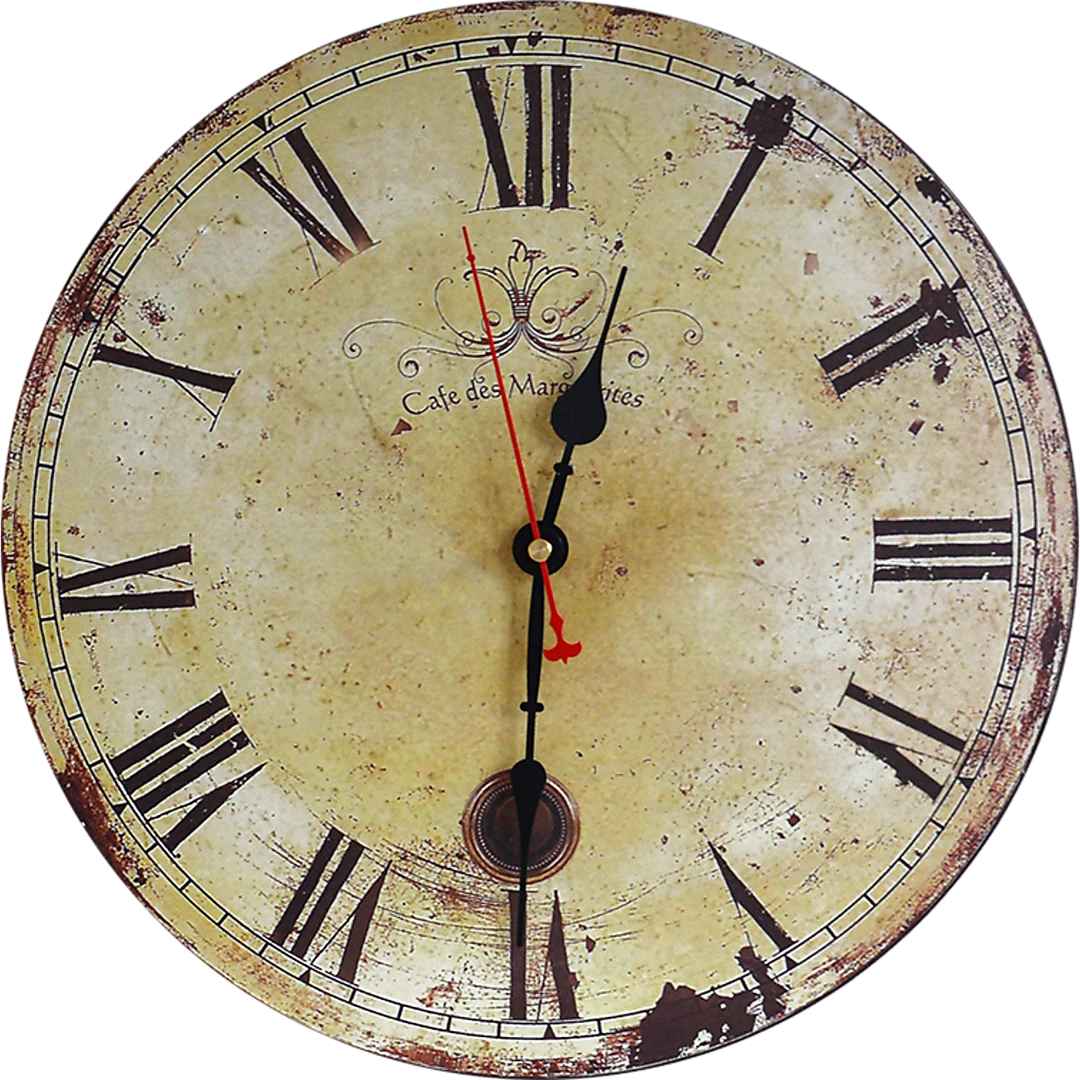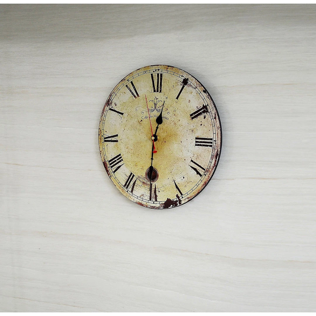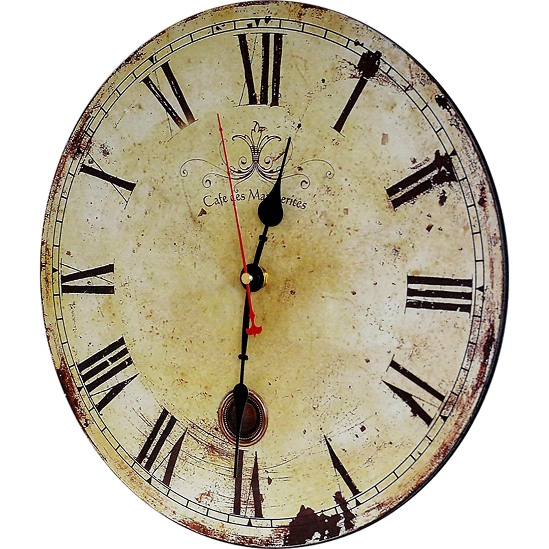 Add a touch of vintage class to your kitchen, living room, hotel lobby, café, or dining room with this gorgeous Roman numeral clock from Randy & Travis Machinery. With its distressed, parchment-paper look, it gives your room an instant sense of gravitas.Â