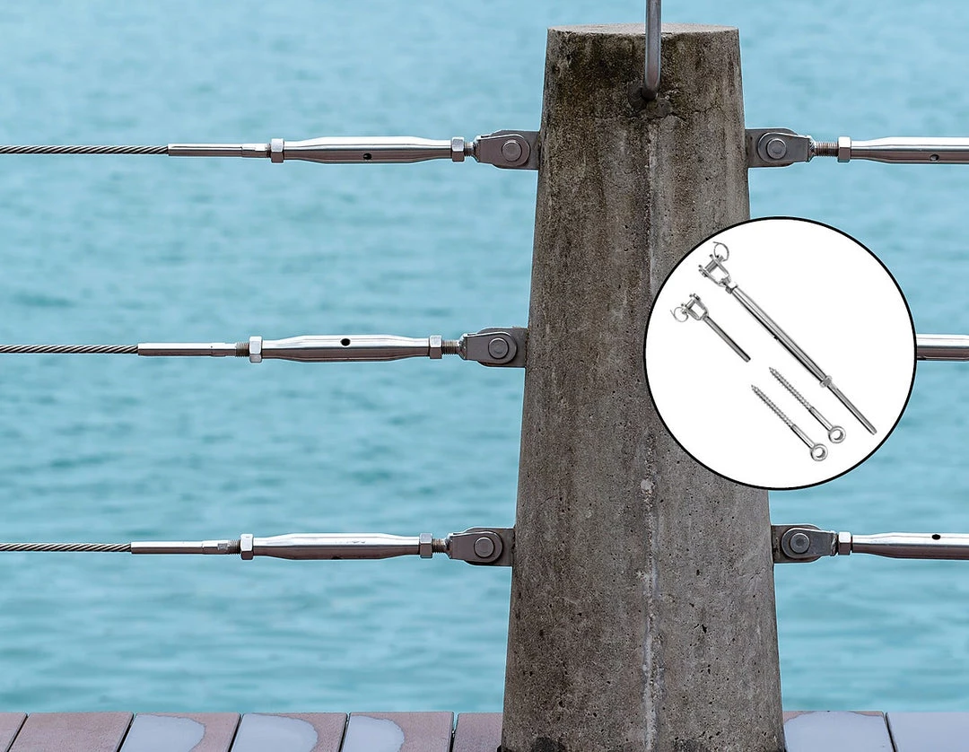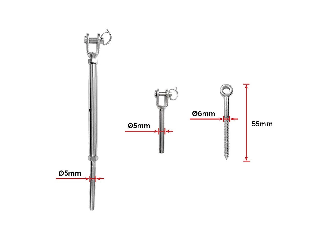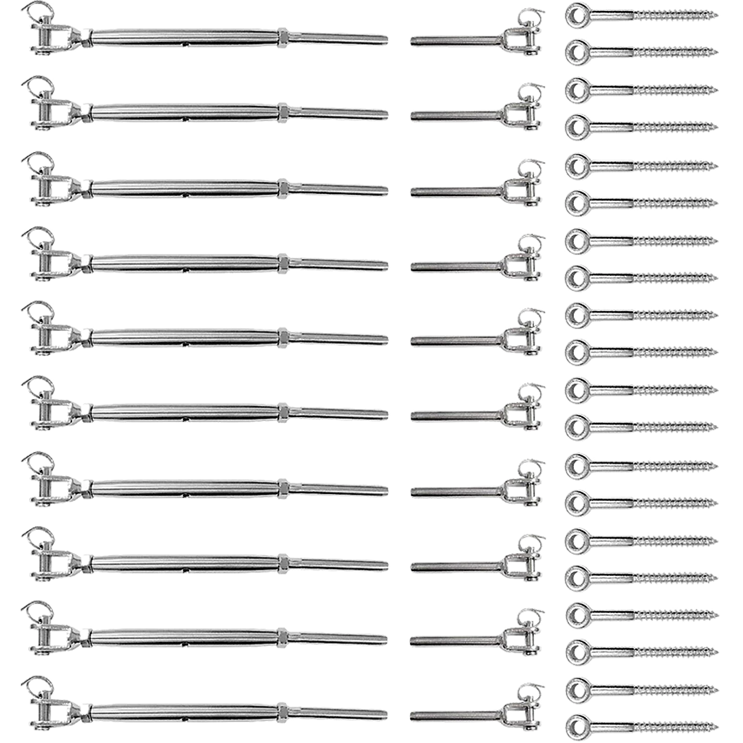 These kits contain 10 turnbuckle rigging screw jaws and swages in marine-grade stainless steel, 10 fork terminals in 316 marine-grade steel, and 20 lag screw and eye combinations, also in marine-grade 316 stainless steel.
