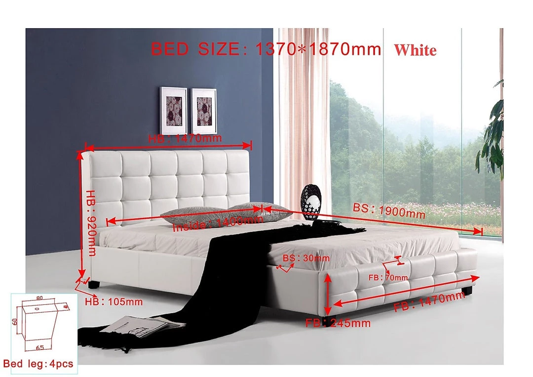 The wooden frame of our Double Deluxe Bed Frame in White PU Leather is easy to assemble, exceptionally sturdy, and will support your mattress for many good night sleeps to come with static loading capacity of 200kg.