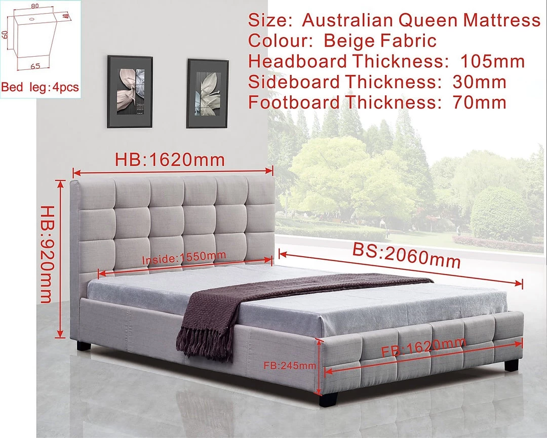 The wooden frame of our Queen Deluxe Bed Frame in Beige Linen Fabric is easy to assemble, exceptionally sturdy, and will support your mattress for many good night sleeps to come with static loading capacity of 200kg.