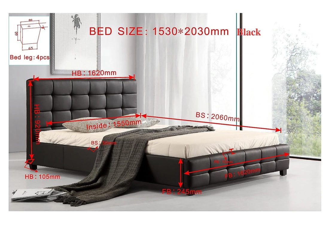 The wooden frame of our Queen Deluxe Bed Frame in Black PU Leather is easy to assemble, exceptionally sturdy, and will support your mattress for many good night sleeps to come with static loading capacity of 200kg.