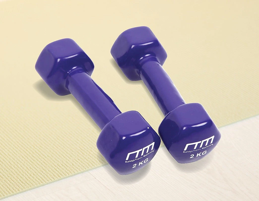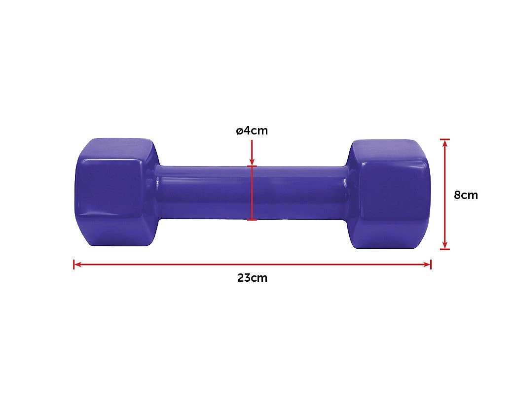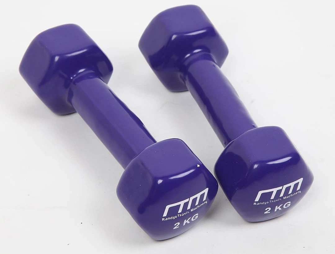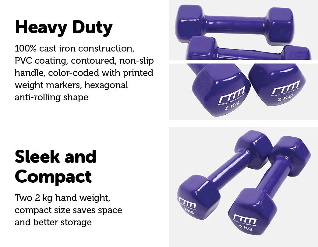 Our 2kg dumbbells are 100% cast iron. They’re PVC coated to prevent rust, minimise wear and tear to the dumbbells and prevent damage to your floor. The coating also provides excellent grip and an attractive colour finish. The hexagonal head shape design prevents it from accidental rolling.