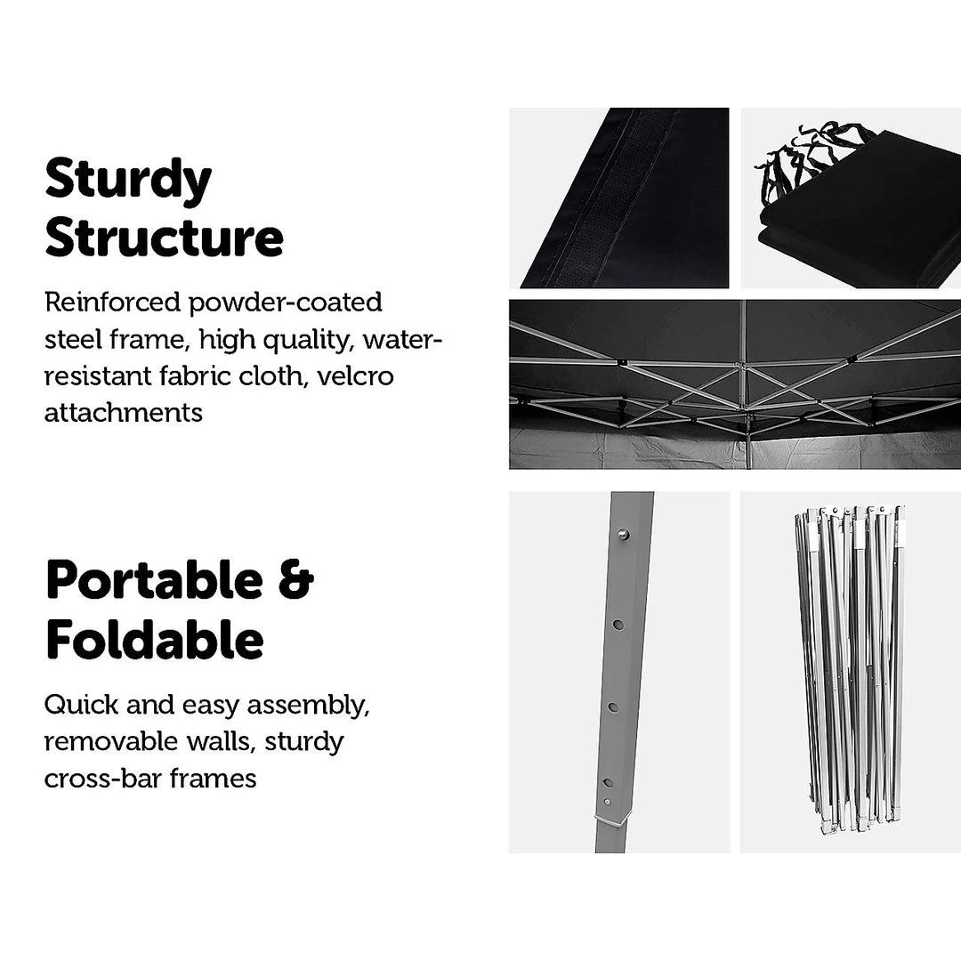 This Black Pop-up Gazebo Tent from Randy & Travis Machinery is your answer. Easily stored in your garage or an outdoor shed, this pop-up tent assembles in minutes – giving you and your guests cover so your event can go as planned.