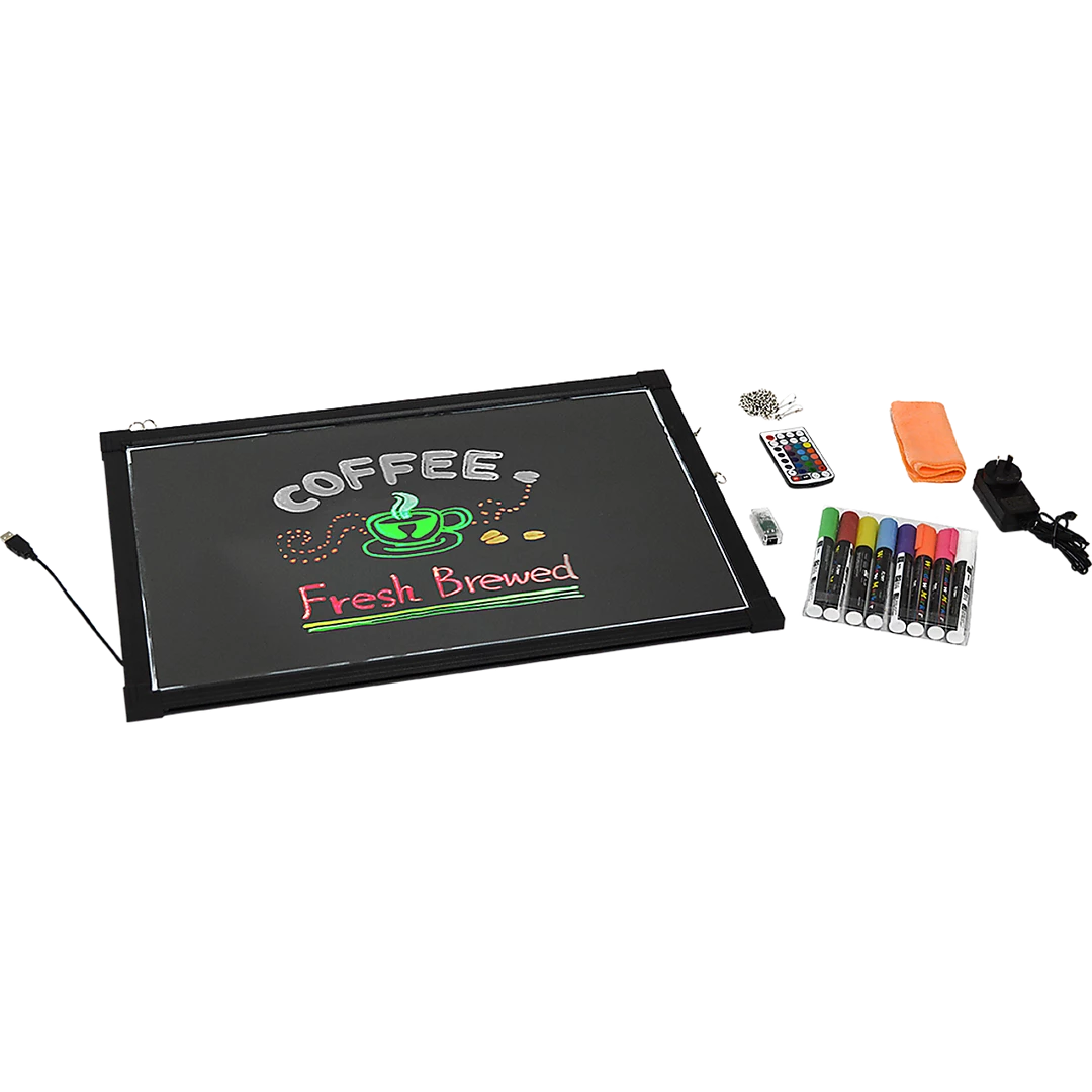 - Accessories: Power adapter, 8 LED fluorescent markers, remote control, cleaning cloth, USB booster, and hanging chain