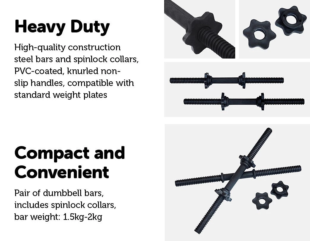 Use these dumbbell bars with standard weight plates with 26.5-millimetre standard hole diameter. They come with two spin-lock collars to fasten the plates in place for ease of lifting. The handles have slip-resistant indentations for better stability and grip.