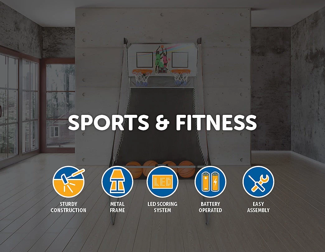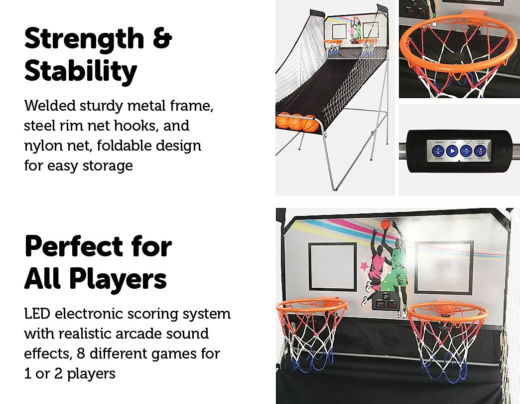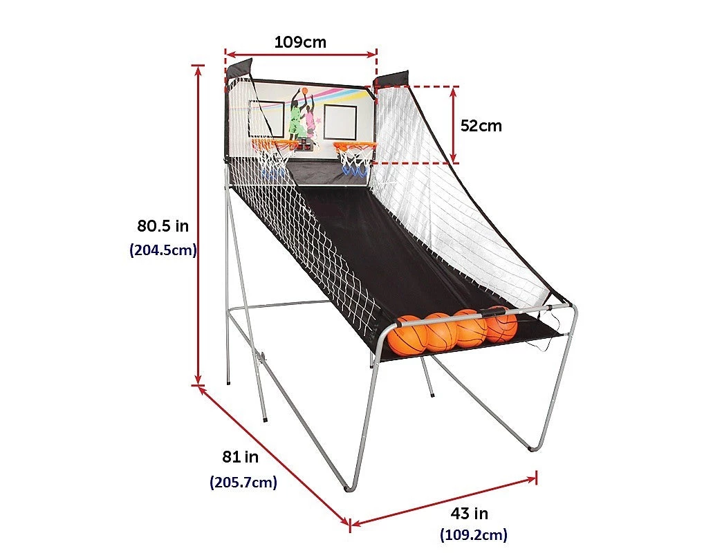 This Arcade Basketball Game is a perfect game for the entire family. It’s designed for one or two players and allows you to choose from eight different game play options. The frame is constructed of sturdy 7/8-inch diameter metal with durable 12-inch diameter steel rims and braces to provide stability during active play. The LED scoring system keeps track of score and time and also has integrated arcade sound effects for an authentic stadium experience. After playing, it can be folded quickly and easily for storage. All accessories are included.Â