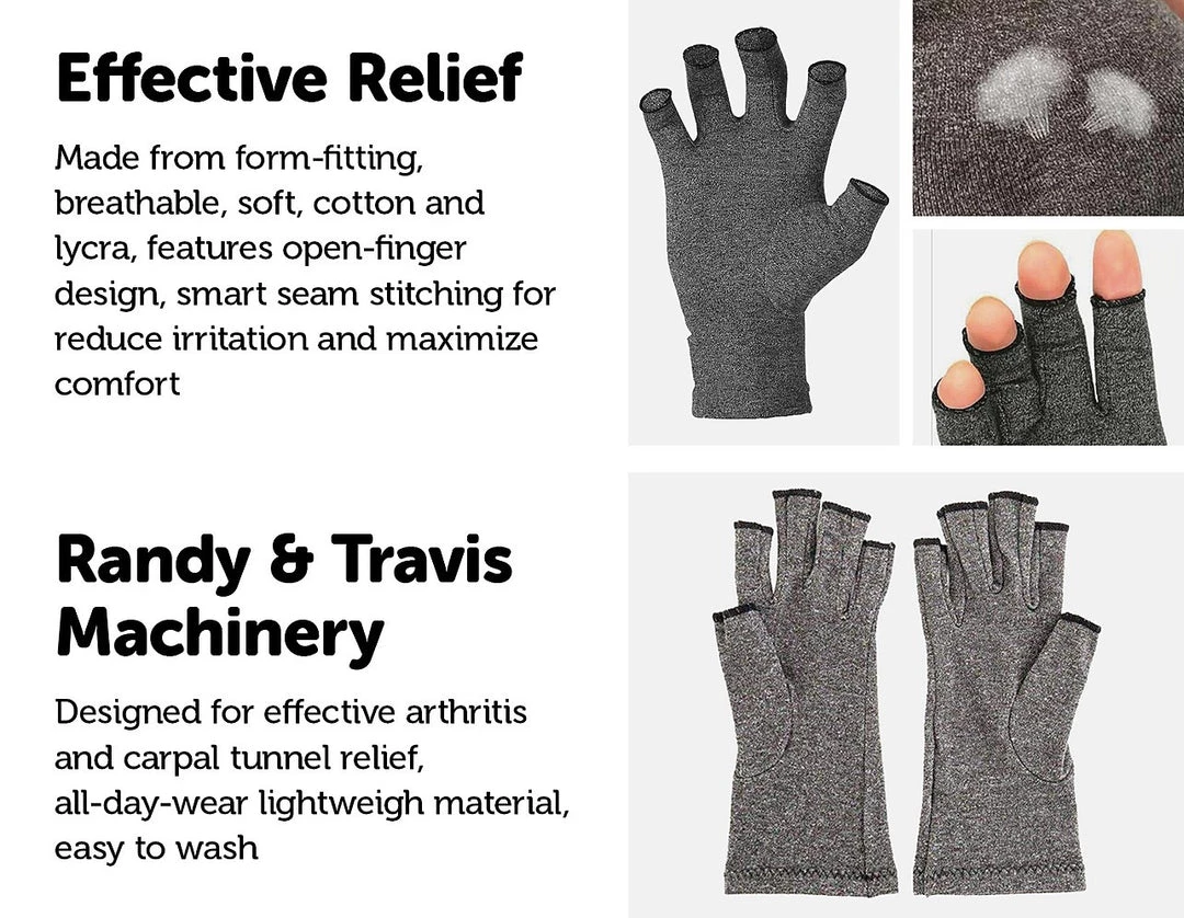 Whether you have arthritis from an old sports injury, rheumatoid arthritis, or simply have trouble keeping your hands warm due to poor circulation or stress, these compression arthritis gloves from Randy & Travis Machinery can relieve your pain and support your hands as you go about your work. In neutral grey, they coordinate with a wide range of colours—so you can look as good as you feel.