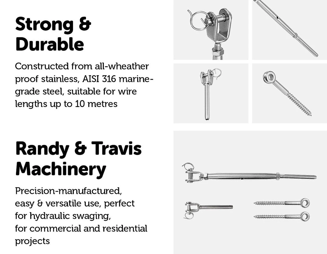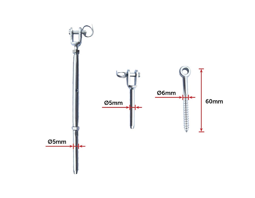 Each handy kit contains 20 packs with both stainless lag eye screws and stainless jaw/swage fork terminal screws. Both the jaw and swage bottlescrew turnbuckle are 5mm x 1/8” (3.2mm). These screws are both connected to timber posts with M6 x 55mm lag eye screws at either end. These screws can be used with a 3.2mm wire rope.