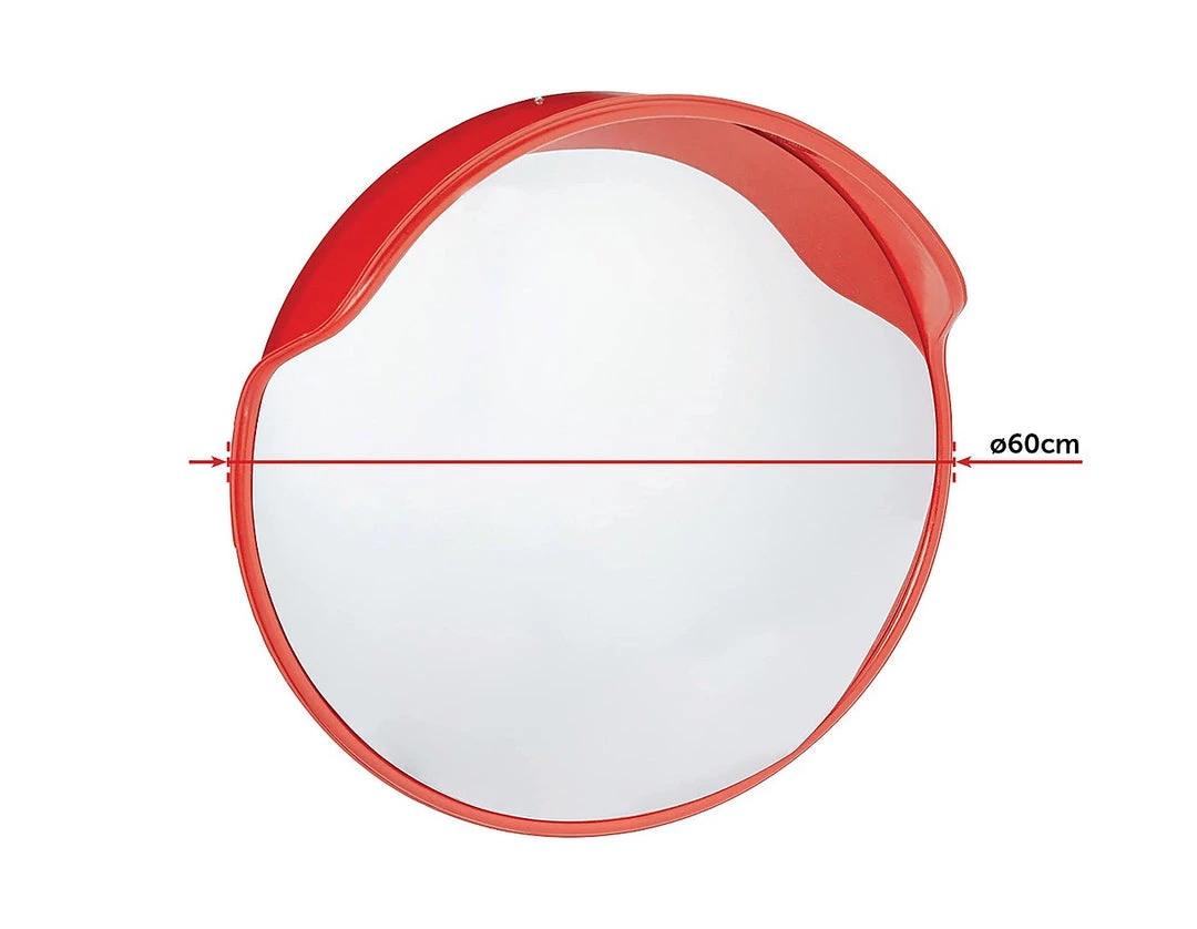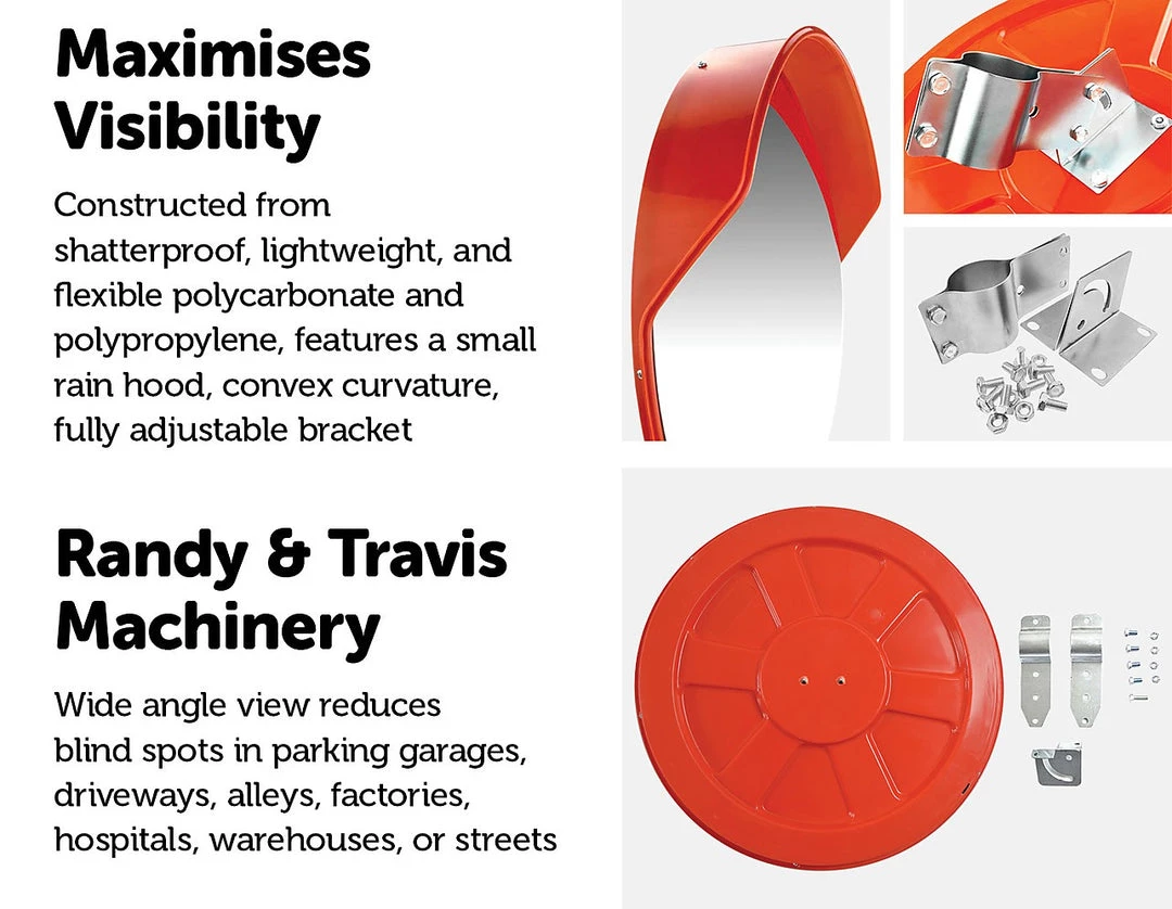 This 60-centimetre convex round blind spot mirror by Randy & Travis Machinery helps to prevent accidents by reducing blind spots in parking garages, driveways, alleys, factories, hospitals, warehouses, or streets. Its convex, wide-angle surface increases the range of vision, allowing drivers and pedestrians to see and avoid hazards ahead, even when there is an obstructed view.