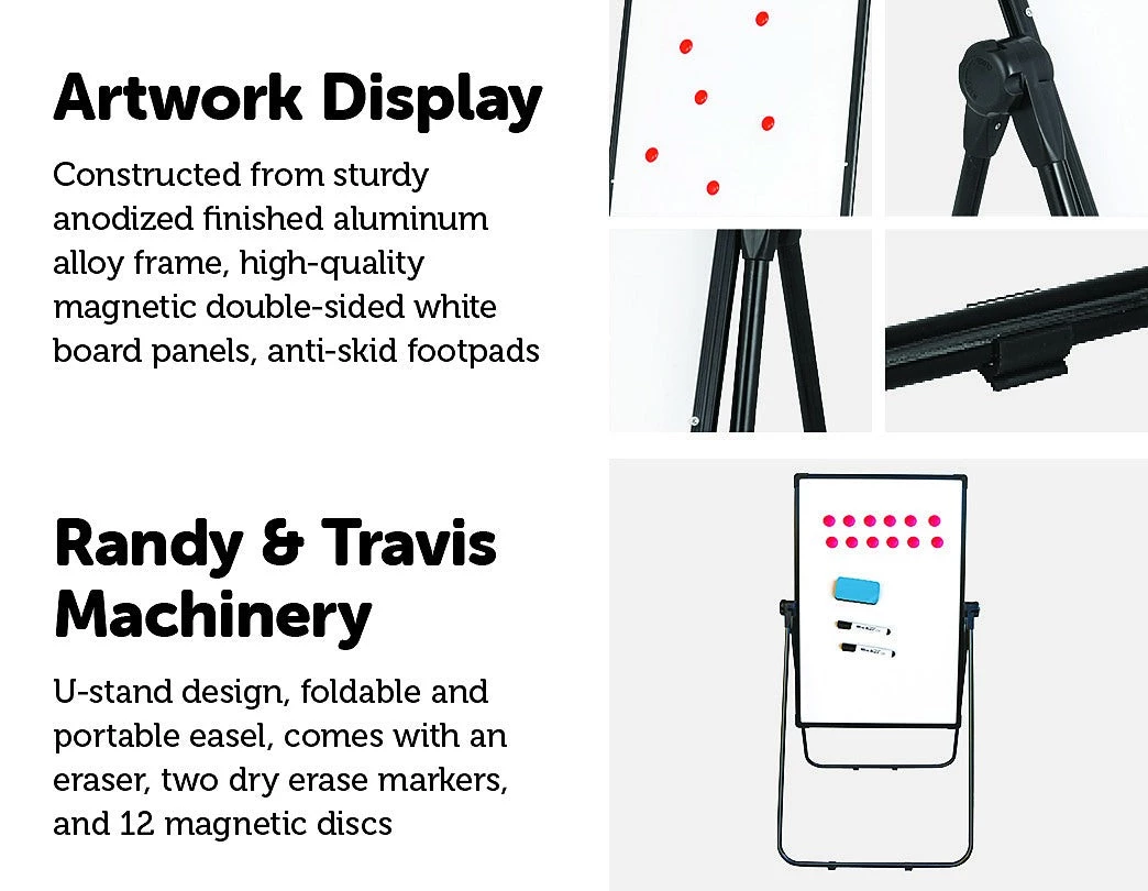 Perfect for presentations at the office, this U-stand whiteboard by Randy & Travis Machinery doubles as a portable easel for the painter in your life. It comes with everything you need for a perfect presentation—an eraser, two dry erase markers, and 12 magnetic discs.