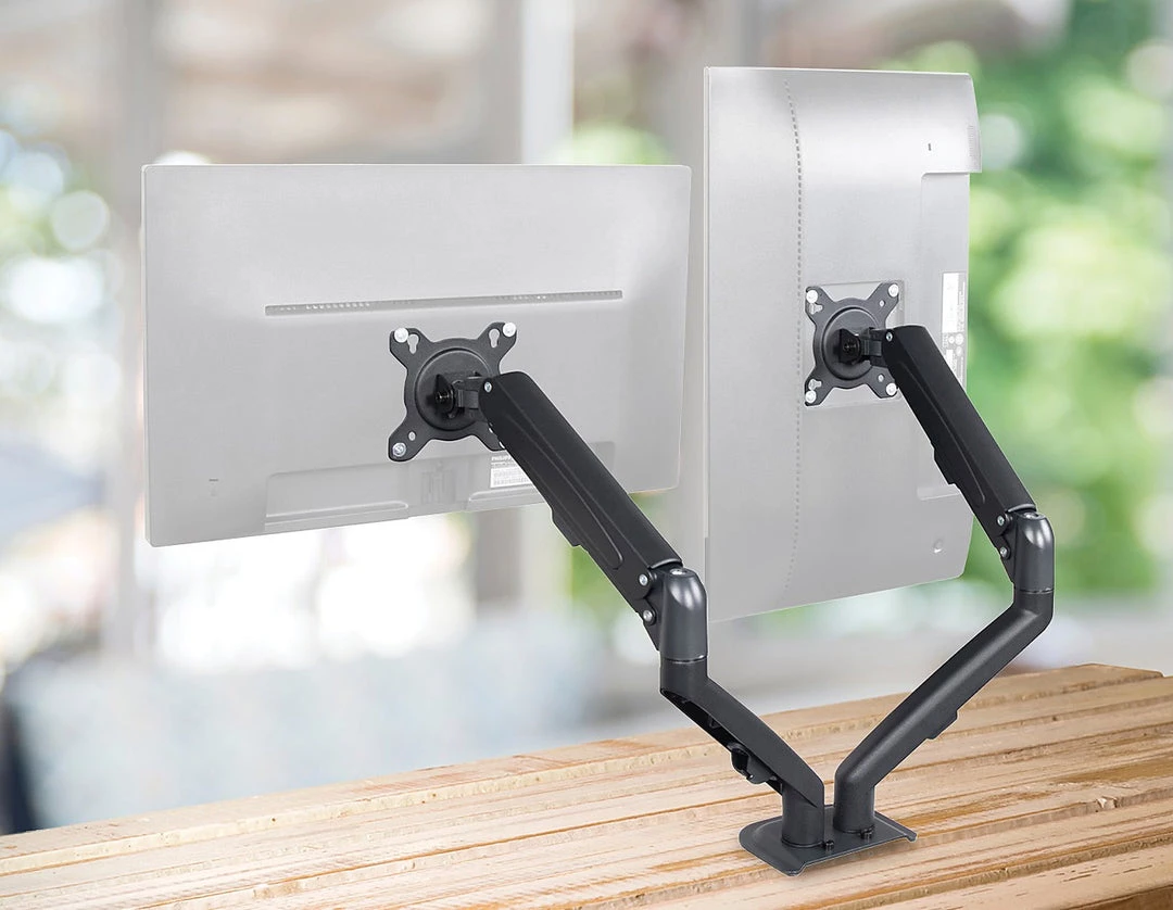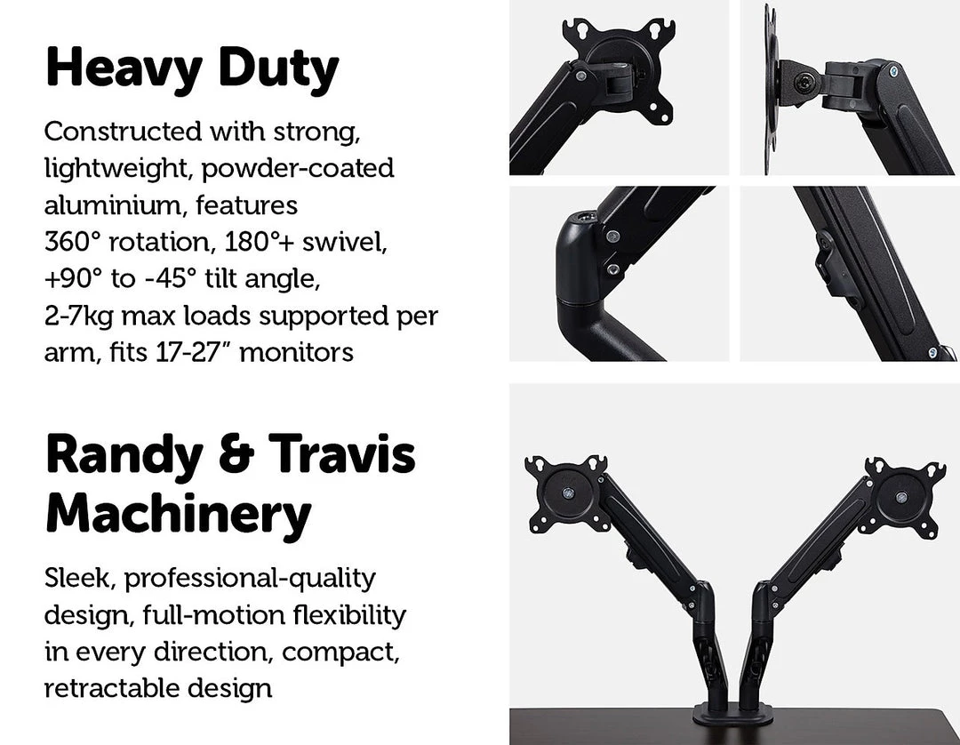 Do your work more efficiently at the office or at home with this dual-screen desktop monitor from Randy & Travis Machinery. With its convenient gas strut design, you can adjust both screens to whatever angle and height work best for you, so you’ll never have to strain your muscles to see your screen again. Thanks to its gravity spring pivot joint construction, it’s easy to tilt it into the perfect position. It’s the perfect solution when you need to collaborate with your co-workers on a project or if you want to avoid wasting your time switching between two different tabs or windows.