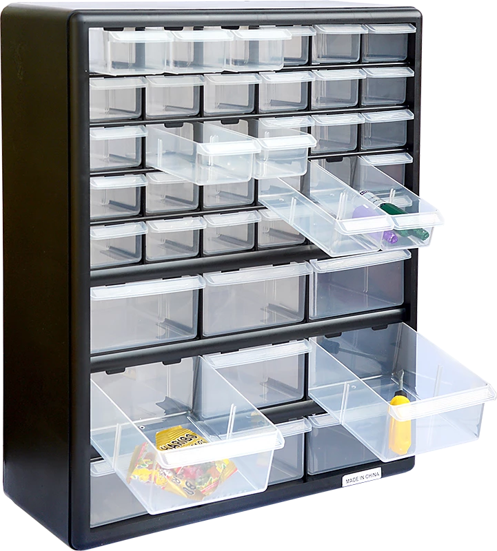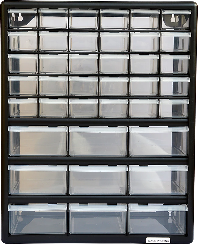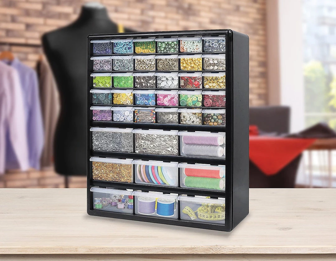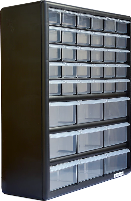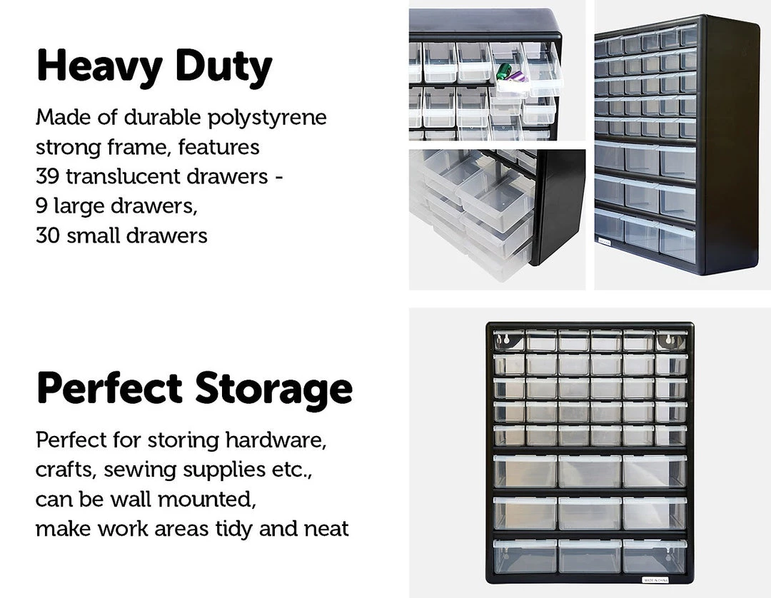This is the Organiser you need to help you create a stress-free, tidy, and neat work place or hobby area. With 39 Plastic Tool Boxes contained in this one organiser, you’ll find a place for every small item in your workspace. It can even be attached to the wall or another surface. Use labels to personalise the clear drawers on this black cabinet. Declutter any space simply and effectively with this Storage Cabinet Cupboard.