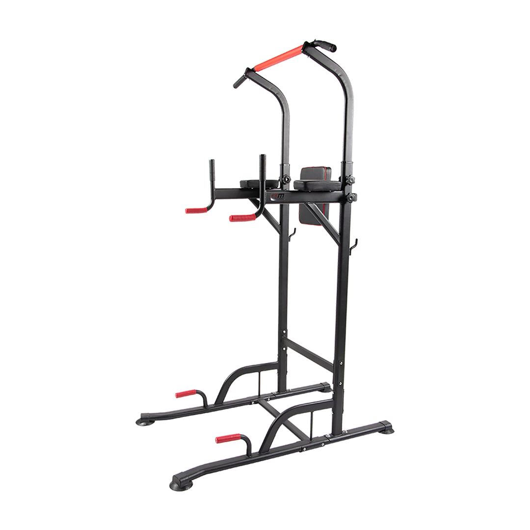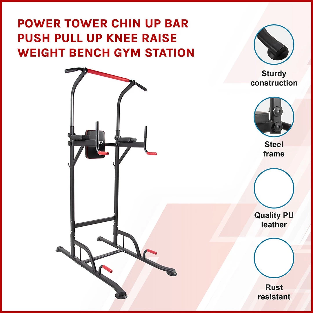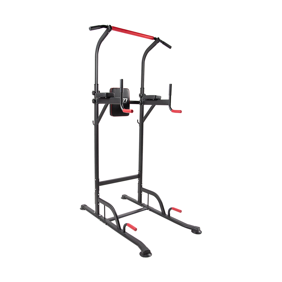 - Includes pull-up and dip bars, leg press station, and knee raise station