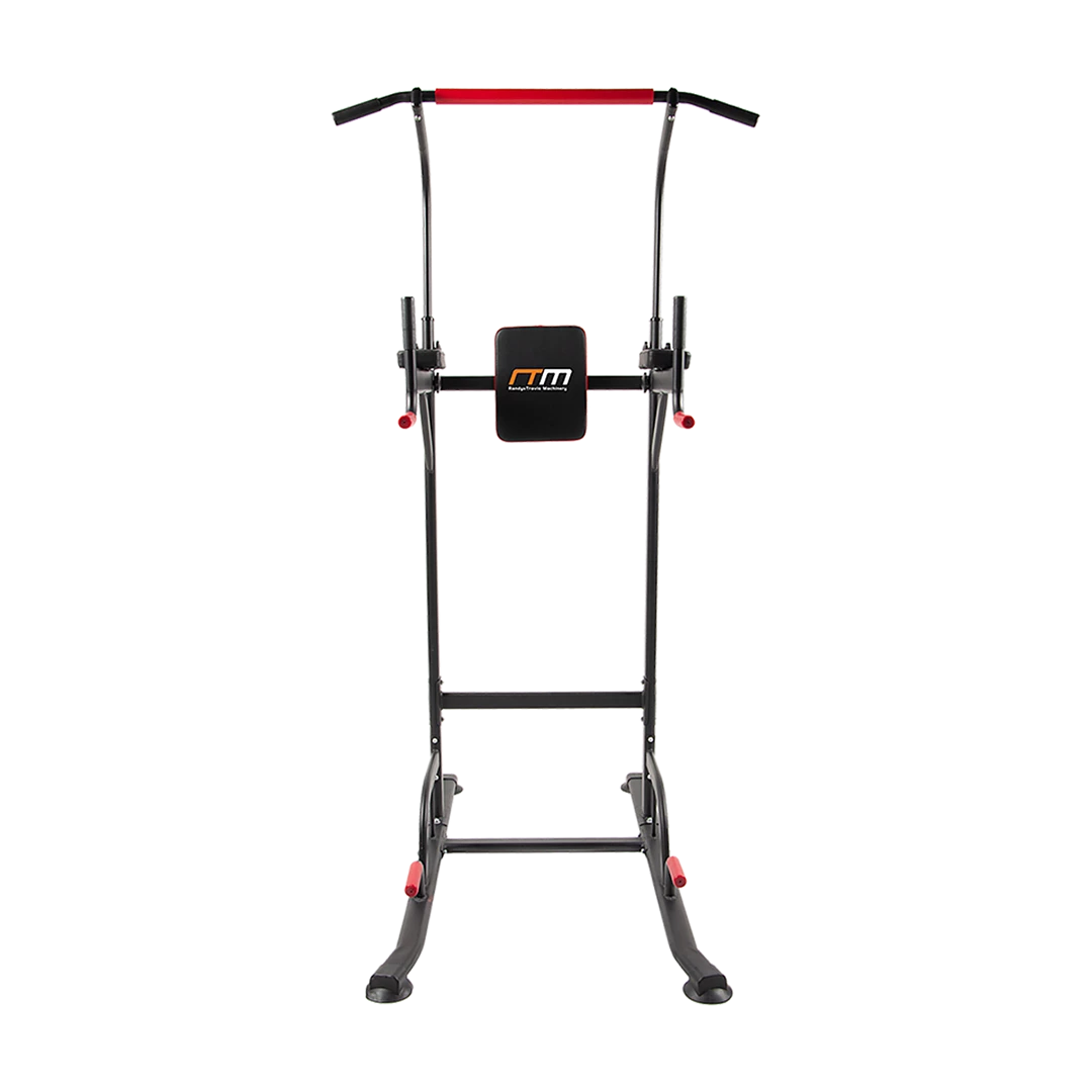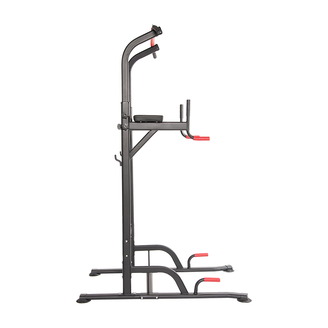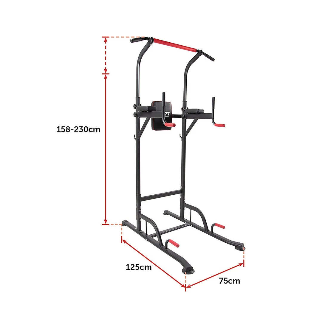 - Includes pull-up and dip bars, leg press station, and knee raise station