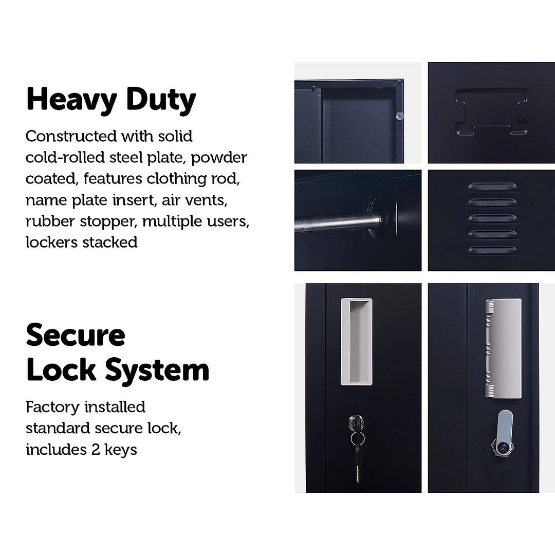 The locker is constructed with solid cold-rolled steel plate for excellent sturdiness and durability, not to mention an attractive look. The steel is also powder-coated to resist corrosion. The locker measures 180 x 76 x 45cm, and the maximum recommended weight capacity is approximately 30kg per locker. Privacy and security are assured with a simple lock and key design. There are spaces designated for labels to help identify lockers, and air vents are built-in to assure sufficient ventilation.
